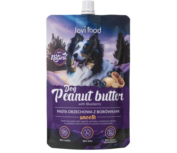 Lovi Food Peanut Butter with Blueberry to naturalna pasta orzechowa dla psa i kota, przygotowana z prażonych orzechów arachidowych i liofilizowanych borówek. Produkt nie zawiera cukru, soli, konserwantów ani GMO, a jego prosty skład zapewnia pełnię smaku i wartości odżywczych.