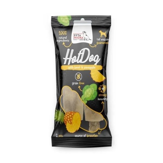Dzięki unikalnej recepturze Hot Dog z Wołowiną i Ananasem Syta Micha stanie się ulubionym przysmakiem Twojego psa, który nie tylko zaspokoi jego apetyt, ale także zapewni mu niezbędne składniki odżywcze. Dzięki temu uzupełnisz jego dietę o zbilansowane składniki odżywcze. Każdy kolejny trening będzie przebiegał po twojej myśli, bo ten przysmak sprawi, że pies chętnie wykona każdą komendę.