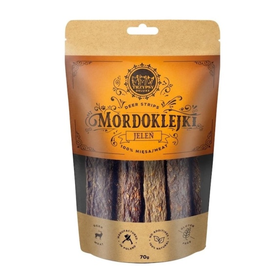 Mordoklejki Trzypsy Deluxe to w pełni naturalne gryzaki dla psów w formie mięsnych pasków, przygotowane ze 100% mięsa. Doskonale sprawdzą się jako nagroda w trakcie treningu, a przy tym są smaczne i wartościowe.
