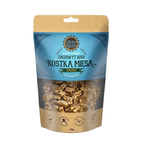 Trzypsy Deluxe Zachwyt nad Kostką Mięsa to zdrowy, naturalny przysmak dla psów w formie drobnych, nieregularnych kosteczek przygotowanych w 100% z mięsa. Dzięki starannie wyselekcjonowanym składnikom i delikatnemu procesowi suszenia smakołyk wyróżnia się wyjątkowym aromatem i smakiem, który zadowoli nawet najbardziej wymagające pupile. Produkt nie zawiera konserwantów ani sztucznych barwników. Doskonale sprawdzi się jako nagroda podczas treningów. Średnica pojedynczej kostki to około 0,8 cm. Opakowanie zawiera 70 g produktu.