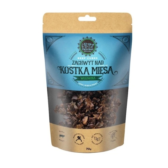 Zachwyt nad Kostką Mięsa to naturalny przysmak dla psów w formie małych kosteczek o wymiarach ok. 0,8 cm, przygotowany w 100% z mięsa. Starannie dobrane składniki oraz delikatny proces suszenia sprawiają, że smakołyk zachowuje wyjątkowy aromat i wartości odżywcze. Produkt nie zawiera konserwantów ani sztucznych barwników. Świetnie sprawdzi się jako nagroda podczas treningów. Opakowanie zawiera 70 g kostek.